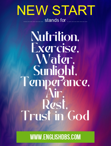 NEW START mostly used in an acronym Miscellaneous in Category Miscellaneous that means Nutrition, Exercise, Water, Sunlight, Temperance, Air, Rest, Trust in God