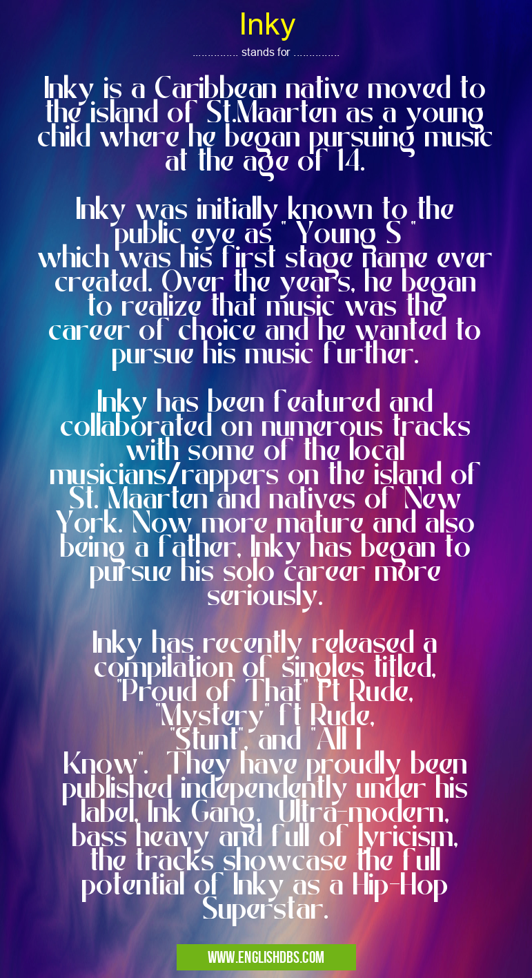 For more information of "Inky is a Caribbean native moved to the island of St.Maarten as a young child where he began pursuing music at the age of 14. Inky was initially known to the public eye as " Young S " which was his first stage name ever created. Over the years, he began to realize that music was the career of choice and he wanted to pursue his music further. Inky has been featured and collaborated on numerous tracks with some of the local musicians/rappers on the island of St. Maarten and natives of New York. Now more mature and also being a father, Inky has began to pursue his solo career more seriously. Inky has recently released a compilation of singles titled, "Proud of That" ft Rude, "Mystery" ft Rude, "Stunt", and "All I Know". They have proudly been published independently under his label, Ink Gang. Ultra-modern, bass heavy and full of lyricism, the tracks showcase the full potential of Inky as a Hip-Hop Superstar.", see the section below.