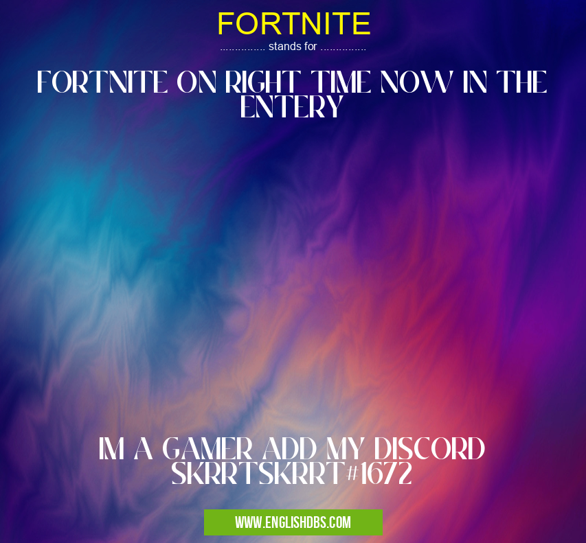 FORTNITE mostly used in an acronym Gaming in Category Computing that means FORTNITE ON RIGHT TIME NOW IN THE ENTERY IM A GAMER ADD MY DISCORD SKRRTSKRRT#1672