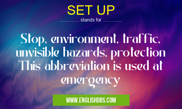 SET UP mostly used in an acronym Medical in Category Medical that means Stop, environment, traffic, unvisible hazards, protection This abbreviation is used at emergency