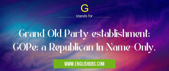 G mostly used in an acronym Politics in Category Governmental that means Grand Old Party establishment; GOPe; a Republican In Name-Only.