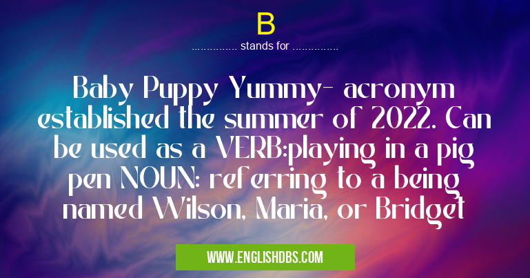 B = Baby Puppy Yummy is an acronym that was established in the summer of 2022. It can be used as a verb or a noun. As a verb, it means to play in a pig pen. As a noun, it refers to a being named Wilson, Maria, or Bridget.