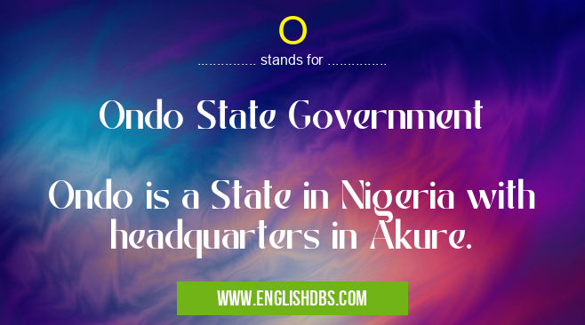 O mostly used in an acronym Governmental in Category Governmental that means Ondo State Government Ondo is a State in Nigeria with headquarters in Akure.