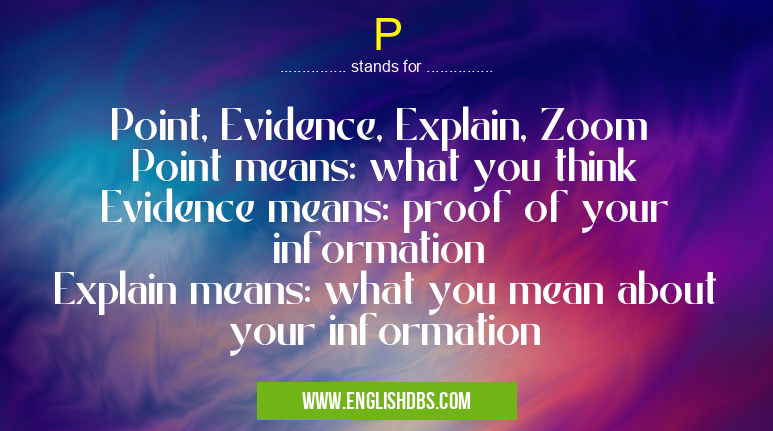 P mostly used in an acronym Literacy in Category Academic & Science that means Point, Evidence, Explain, Zoom Point means: what you think Evidence means: proof of your information Explain means: what you mean about your information