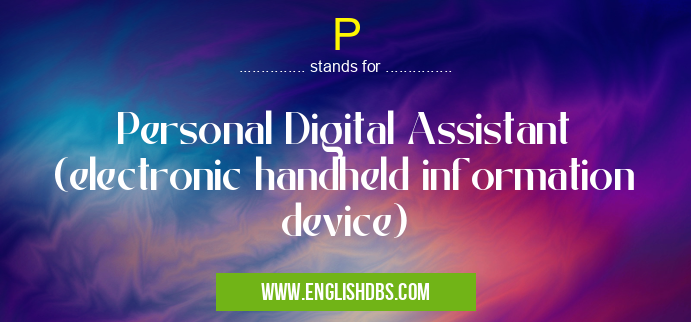 P mostly used in an acronym Electronics in Category Academic & Science that means Personal Digital Assistant (electronic handheld information device)