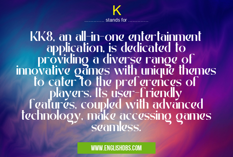 K mostly used in an acronym Sports in Category Sports that means KK8, an all-in-one entertainment application, is dedicated to providing a diverse range of innovative games with unique themes to cater to the preferences of players. Its user-friendly features, coupled with advanced technology, make accessing games seamless.