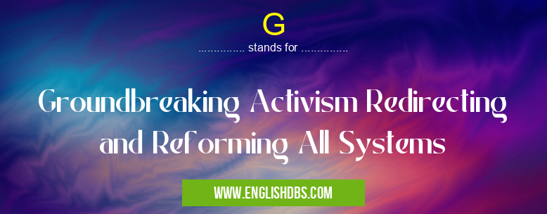 G mostly used in an acronym Unclassified in Category Miscellaneous that means Groundbreaking Activism Redirecting and Reforming All Systems