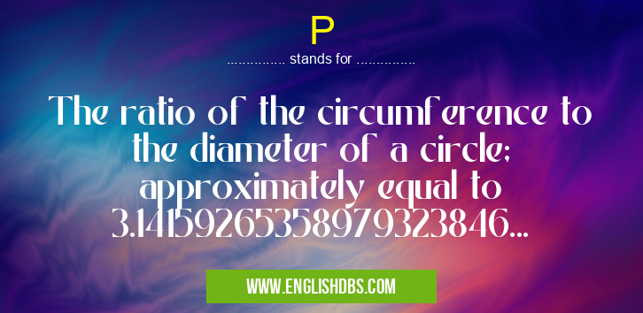 P mostly used in an acronym Mathematics in Category Academic & Science that means The ratio of the circumference to the diameter of a circle; approximately equal to 3.14159265358979323846...