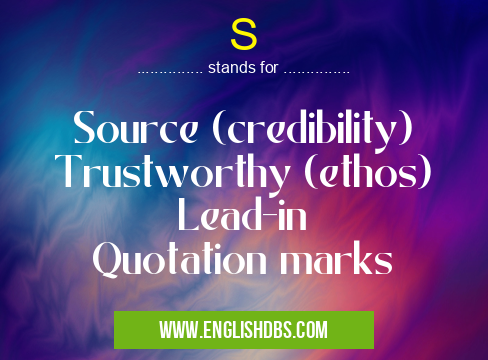 S mostly used in an acronym Language & Literature in Category Academic & Science that means Source (credibility) Trustworthy (ethos) Lead-in Quotation marks