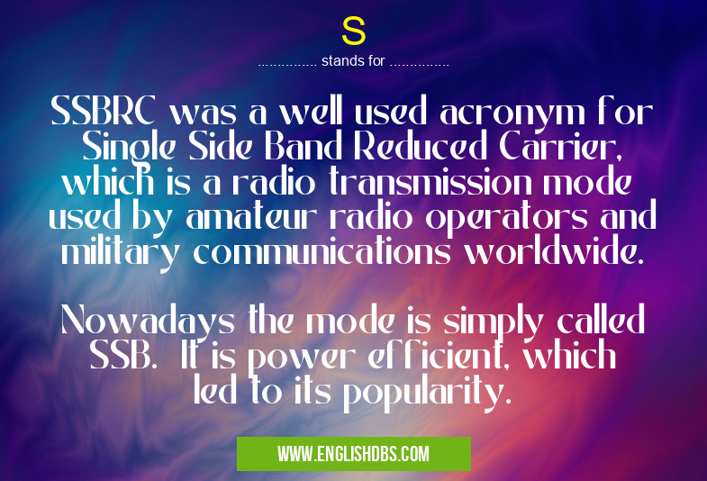 Full Form: SSBRC was a well used acronym for Single Side Band Reduced Carrier, which is a radio transmission mode