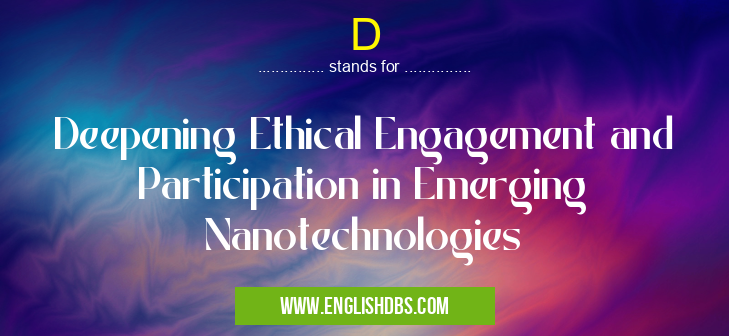 D mostly used in an acronym Unclassified in Category Miscellaneous that means Deepening Ethical Engagement and Participation in Emerging Nanotechnologies
