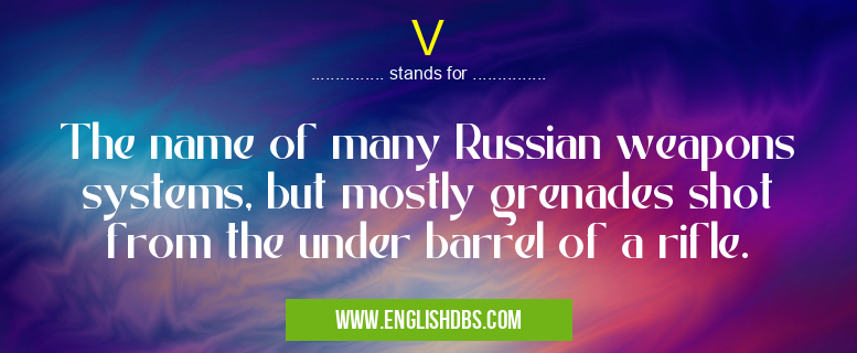 V mostly used in an acronym Military in Category Governmental that means The name of many Russian weapons systems, but mostly grenades shot from the under barrel of a rifle.