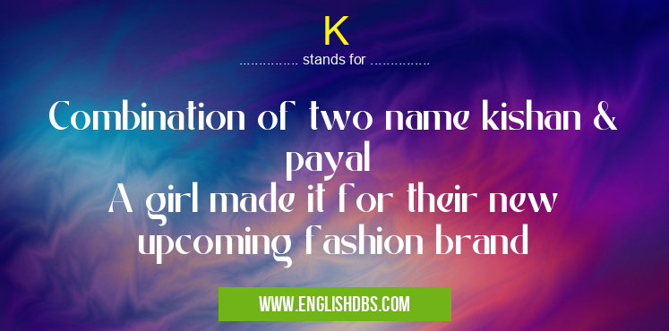 K mostly used in an acronym Fashion & Beauty in Category Community that means Combination of two name kishan & payal A girl made it for their new upcoming fashion brand