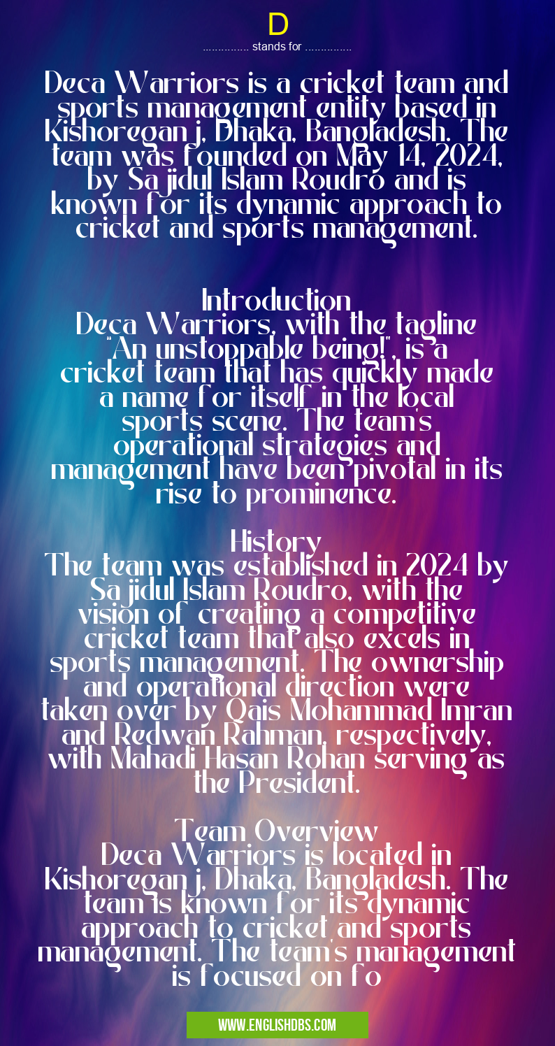 D mostly used in an acronym Sports in Category Sports that means Deca Warriors is a cricket team and sports management entity based in Kishoreganj, Dhaka, Bangladesh. The team was founded on May 14, 2024, by Sajidul Islam Roudro and is known for its dynamic approach to cricket and sports management. Introduction Deca Warriors, with the tagline “An unstoppable being!”, is a cricket team that has quickly made a name for itself in the local sports scene. The team’s operational strategies and management have been pivotal in its rise to prominence. History The team was established in 2024 by Sajidul Islam Roudro, with the vision of creating a competitive cricket team that also excels in sports management. The ownership and operational direction were taken over by Qais Mohammad Imran and Redwan Rahman, respectively, with Mahadi Hasan Rohan serving as the President. Team Overview Deca Warriors is located in Kishoreganj, Dhaka, Bangladesh. The team is known for its dynamic approach to cricket and sports management. The team’s management is focused on fo