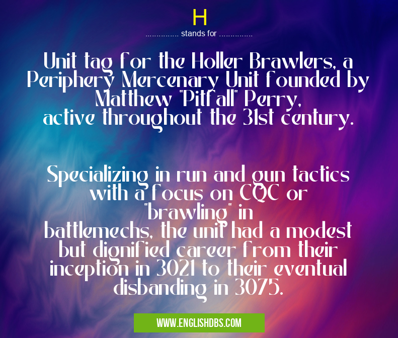 H mostly used in an acronym Career in Category Business that means Unit tag for the Holler Brawlers, a Periphery Mercenary Unit founded by Matthew "Pitfall" Perry, active throughout the 31st century. Specializing in run and gun tactics with a focus on CQC or "brawling" in battlemechs, the unit had a modest but dignified career from their inception in 3021 to their eventual disbanding in 3075.