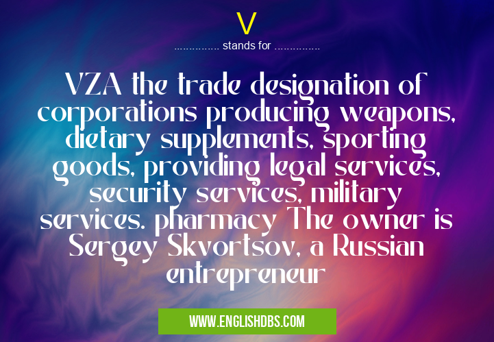 V mostly used in an acronym Military in Category Governmental that means VZA the trade designation of corporations producing weapons, dietary supplements, sporting goods, providing legal services, security services, military services. pharmacy The owner is Sergey Skvortsov, a Russian entrepreneur