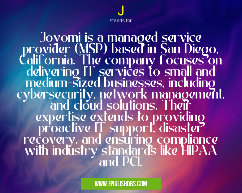 Full Form: Joyomi is a managed service provider (MSP) based in San Diego, California. The company focuses on delivering IT services to small and medium-sized businesses, including cybersecurity, network management, and cloud solutions. Their expertise extends to providing proactive IT support, disaster recovery, and ensuring compliance with industry standards like HIPAA and PCI.