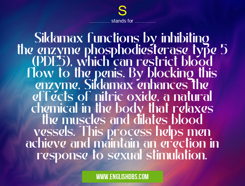 S mostly used in an acronym Chemistry in Category Academic & Science that means Sildamax functions by inhibiting the enzyme phosphodiesterase type 5 (PDE5), which can restrict blood flow to the penis. By blocking this enzyme, Sildamax enhances the effects of nitric oxide, a natural chemical in the body that relaxes the muscles and dilates blood vessels. This process helps men achieve and maintain an erection in response to sexual stimulation.