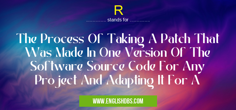R mostly used in an acronym Software in Category Computing that means The Process Of Taking A Patch That Was Made In One Version Of The Software Source Code For Any Project And Adapting It For A