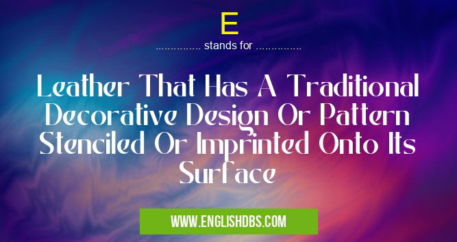 E mostly used in an acronym Unclassified in Category Miscellaneous that means Leather That Has A Traditional Decorative Design Or Pattern Stenciled Or Imprinted Onto Its Surface