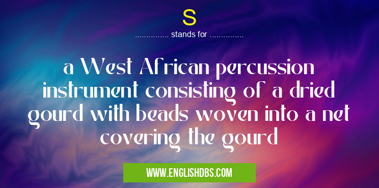 S mostly used in an acronym African in Category Regional that means a West African percussion instrument consisting of a dried gourd with beads woven into a net covering the gourd