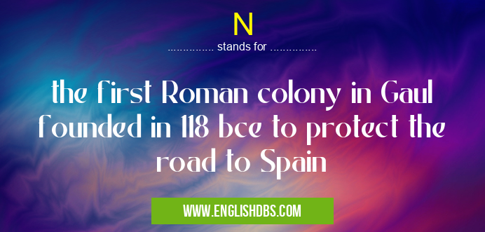 N mostly used in an acronym Unclassified in Category Miscellaneous that means the first Roman colony in Gaul founded in 118 bce to protect the road to Spain