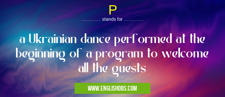 P mostly used in an acronym Unclassified in Category Miscellaneous that means a Ukrainian dance performed at the beginning of a program to welcome all the guests