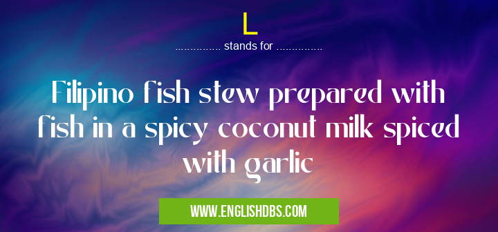 L mostly used in an acronym Unclassified in Category Miscellaneous that means Filipino fish stew prepared with fish in a spicy coconut milk spiced with garlic