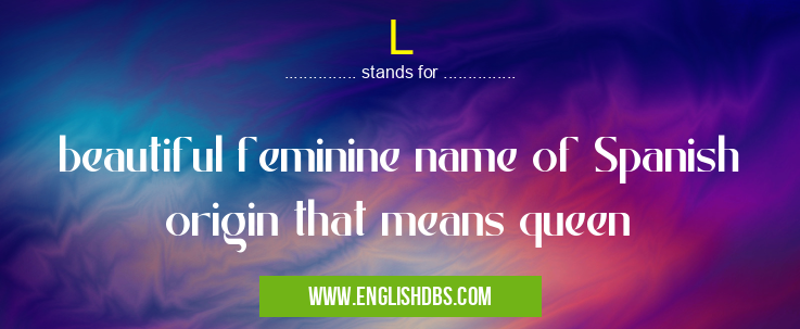 L mostly used in an acronym Spanish in Category International that means beautiful feminine name of Spanish origin that means queen
