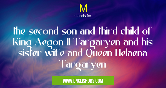 M mostly used in an acronym Unclassified in Category Miscellaneous that means the second son and third child of King Aegon II Targaryen and his sister wife and Queen Helaena Targaryen