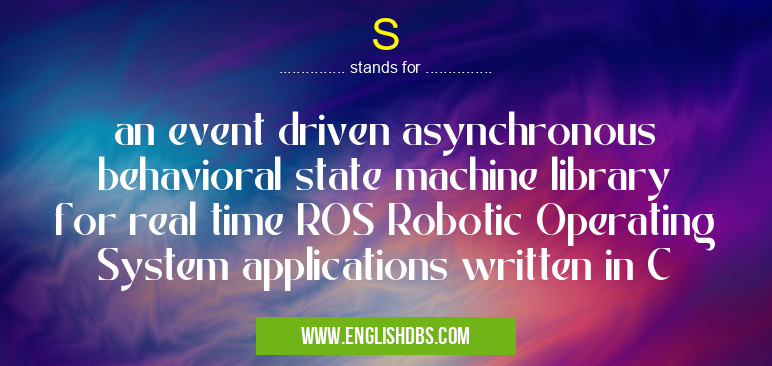 S mostly used in an acronym Libraries in Category Academic & Science that means an event driven asynchronous behavioral state machine library for real time ROS Robotic Operating System applications written in C