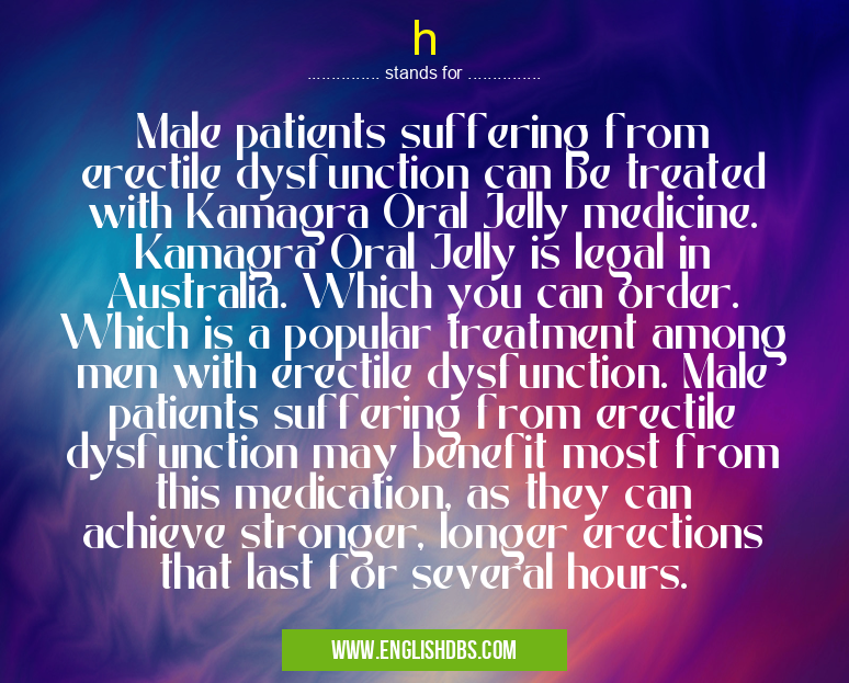 h mostly used in an acronym Law & Legal in Category Governmental that means Male patients suffering from erectile dysfunction can be treated with Kamagra Oral Jelly medicine. Kamagra Oral Jelly is legal in Australia. Which you can order. Which is a popular treatment among men with erectile dysfunction. Male patients suffering from erectile dysfunction may benefit most from this medication, as they can achieve stronger, longer erections that last for several hours.
