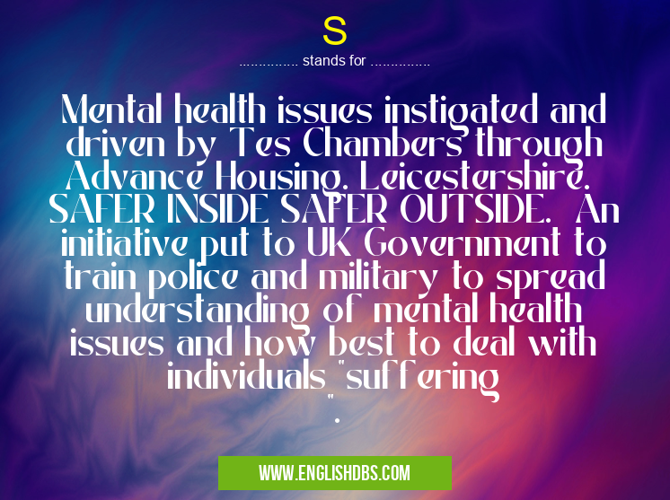 S mostly used in an acronym Healthcare in Category Medical that means Mental health issues instigated and driven by Tes Chambers through Advance Housing. Leicestershire. SAFER INSIDE SAFER OUTSIDE. An initiative put to UK Government to train police and military to spread understanding of mental health issues and how best to deal with individuals "suffering ".