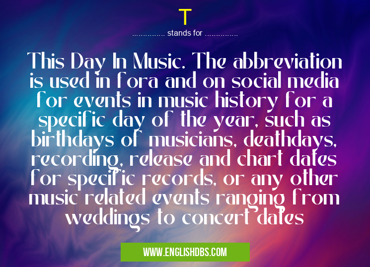 T mostly used in an acronym Music in Category Community that means This Day In Music. The abbreviation is used in fora and on social media for events in music history for a specific day of the year, such as birthdays of musicians, deathdays, recording, release and chart dates for specific records, or any other music related events ranging from weddings to concert dates