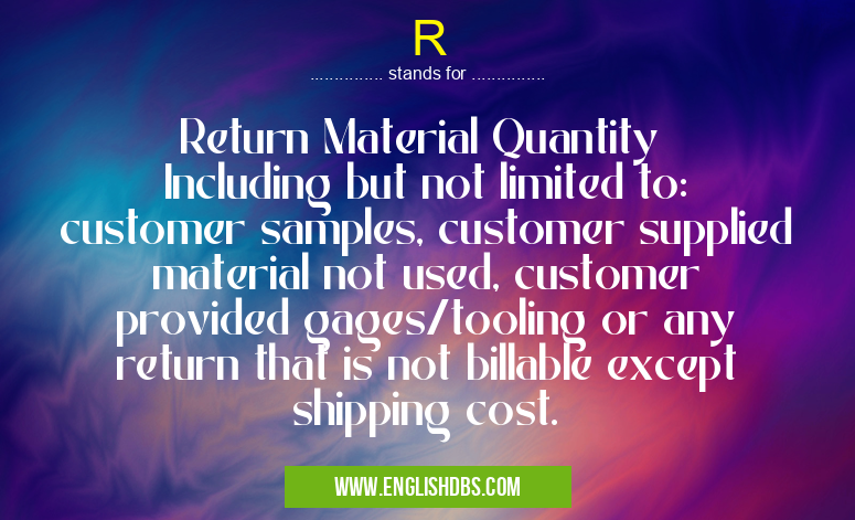 R mostly used in an acronym Business in Category Business that means Return Material Quantity Including but not limited to: customer samples, customer supplied material not used, customer provided gages/tooling or any return that is not billable except shipping cost.