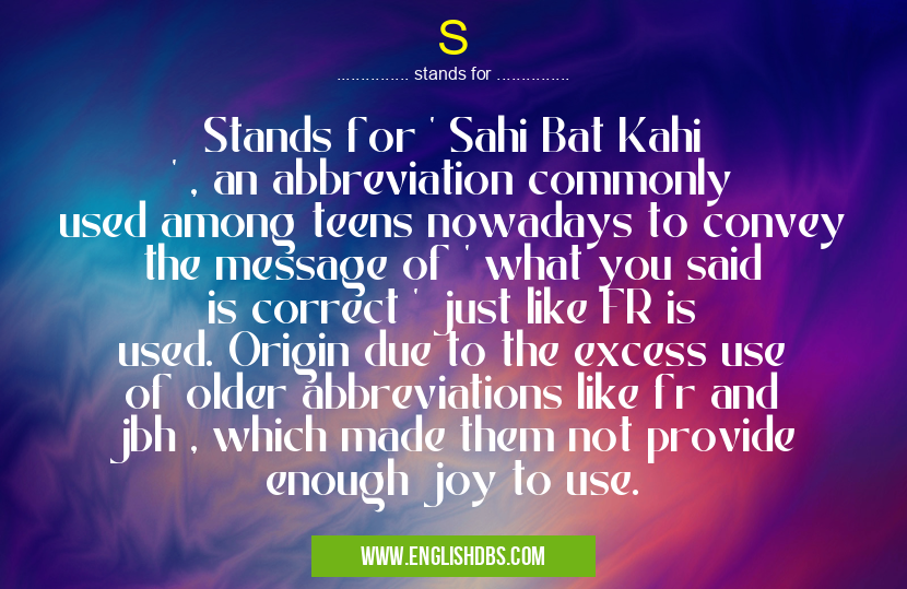 S mostly used in an acronym Chat in Category Internet that means Stands for ' Sahi Bat Kahi ' , an abbreviation commonly used among teens nowadays to convey the message of ' what you said is correct ' just like FR is used. Origin due to the excess use of older abbreviations like fr and jbh , which made them not provide enough joy to use.