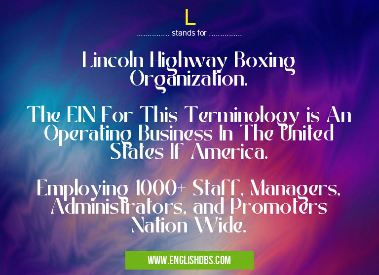 L mostly used in an acronym Business in Category Business that means Lincoln Highway Boxing Organization. The EIN For This Terminology is An Operating Business In The United States If America. Employing 1000+ Staff, Managers, Administrators, and Promoters Nation Wide.
