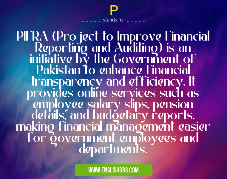 P mostly used in an acronym Management in Category Business that means PIFRA (Project to Improve Financial Reporting and Auditing) is an initiative by the Government of Pakistan to enhance financial transparency and efficiency. It provides online services such as employee salary slips, pension details, and budgetary reports, making financial management easier for government employees and departments.
