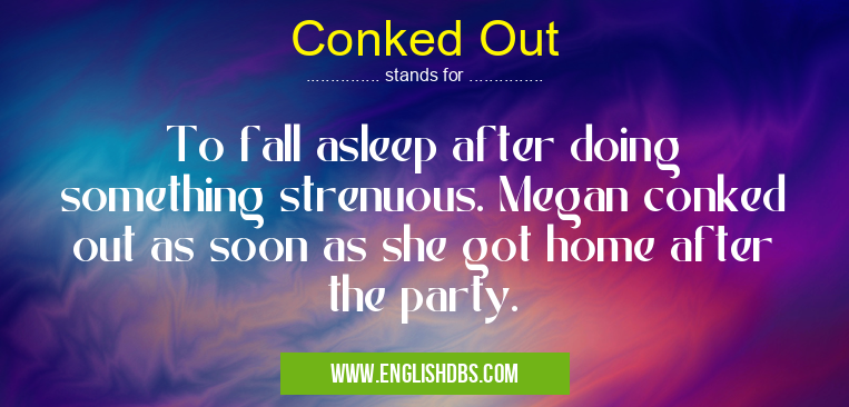 Conked Out mostly used in an acronym Miscellaneous in Category Miscellaneous that means To fall asleep after doing something strenuous. Megan conked out as soon as she got home after the party.