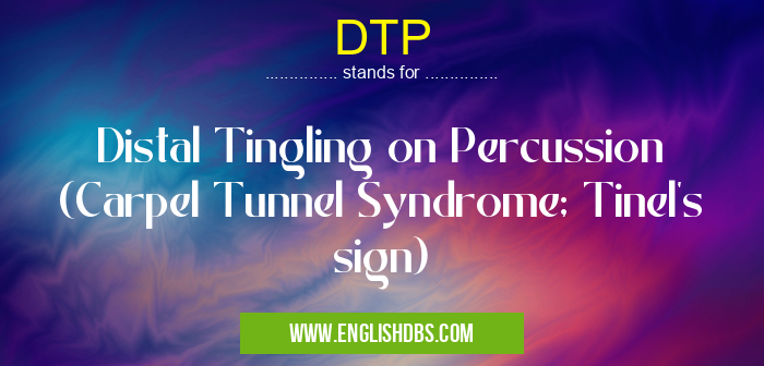 DTP mostly used in an acronym Physiology in Category Medical that means Distal Tingling on Percussion (Carpel Tunnel Syndrome; Tinel's sign)