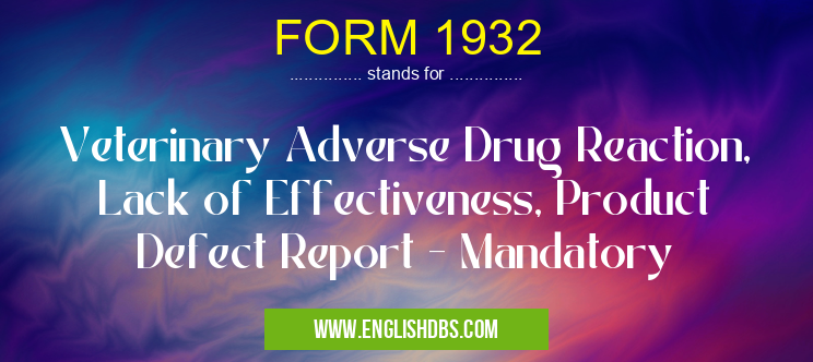 FORM 1932 mostly used in an acronym FDA in Category Governmental that means Veterinary Adverse Drug Reaction, Lack of Effectiveness, Product Defect Report - Mandatory