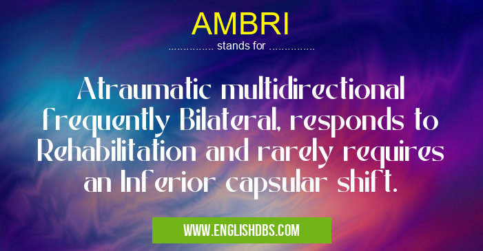 AMBRI mostly used in an acronym British Medicine in Category Medical that means Atraumatic multidirectional frequently Bilateral, responds to Rehabilitation and rarely requires an Inferior capsular shift.