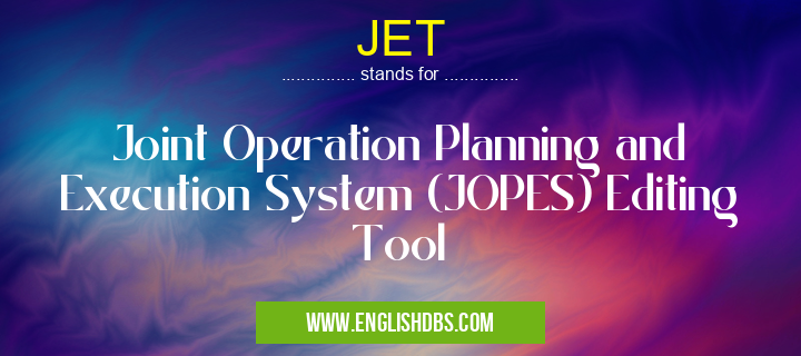 JET mostly used in an acronym Military in Category Governmental that means Joint Operation Planning and Execution System (JOPES) Editing Tool