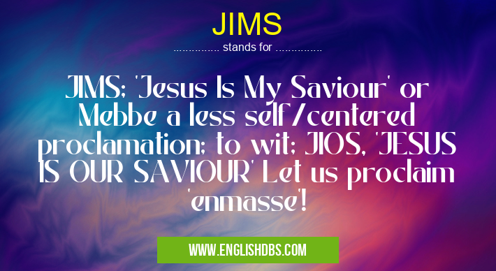 JIMS mostly used in an acronym Miscellaneous in Category Miscellaneous that means JIMS; 'Jesus Is My Saviour' or Mebbe a less self/centered proclamation; to wit; JIOS, 'JESUS IS OUR SAVIOUR' Let us proclaim 'enmasse'!