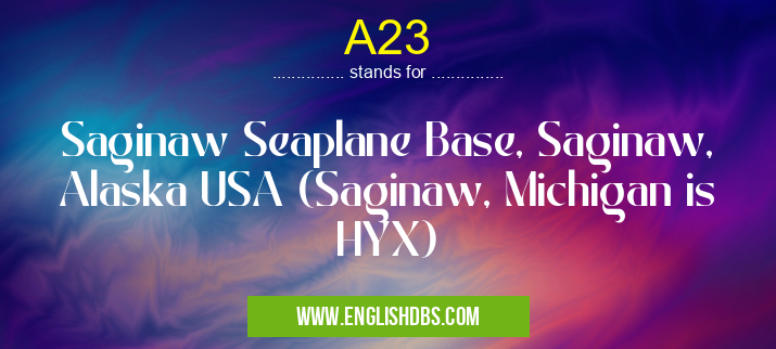 A23 mostly used in an acronym Airport Codes in Category Regional that means Saginaw Seaplane Base, Saginaw, Alaska USA (Saginaw, Michigan is HYX)