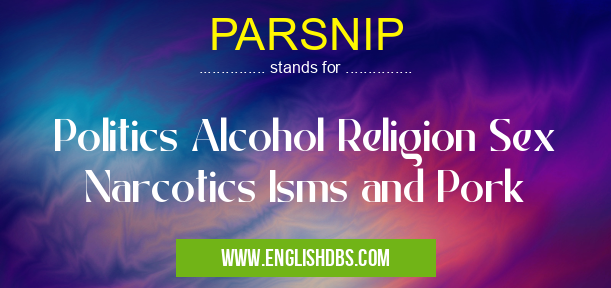PARSNIP mostly used in an acronym Religion in Category Community that means Politics Alcohol Religion Sex Narcotics Isms and Pork