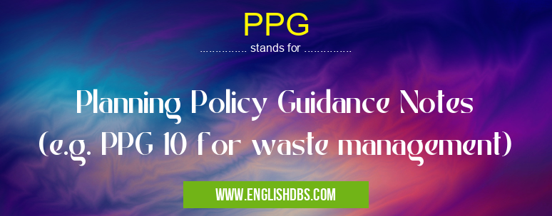 PPG mostly used in an acronym Waste Managment in Category Community that means Planning Policy Guidance Notes (e.g. PPG 10 for waste management)