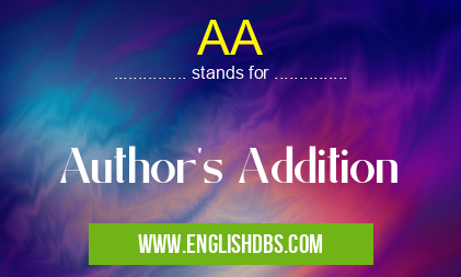 AA stands for the term "Author's Addition". It is commonly used in educational and community settings as an abbreviation for a user-made addendum to an existing document, such as a study guide, reference book, or article. This addendum is typically made by the author of the original work and is intended to supplement the body of information provided in said work. AA provides greater context for understanding and analyzing an existing text by making additional notes or observations about both the main idea and details presented throughout it.