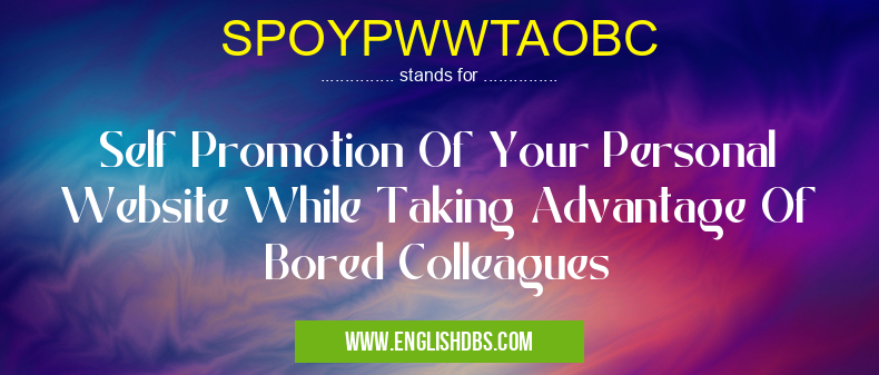 SPOYPWWTAOBC mostly used in an acronym Chat in Category Internet that means Self Promotion Of Your Personal Website While Taking Advantage Of Bored Colleagues