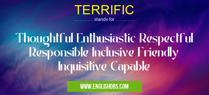 TERRIFIC mostly used in an acronym Unclassified in Category Miscellaneous that means Thoughtful Enthusiastic Respectful Responsible Inclusive Friendly Inquisitive Capable